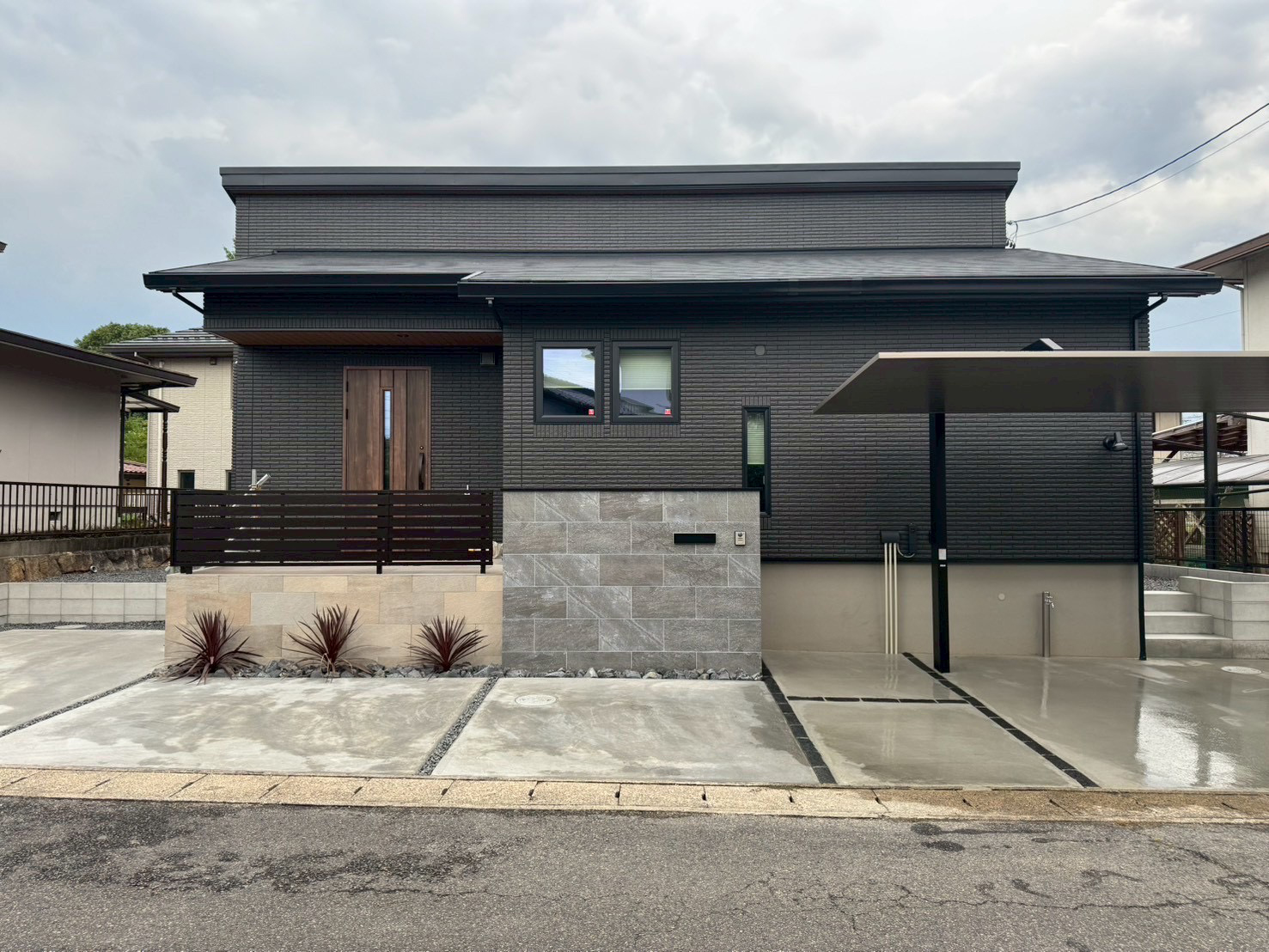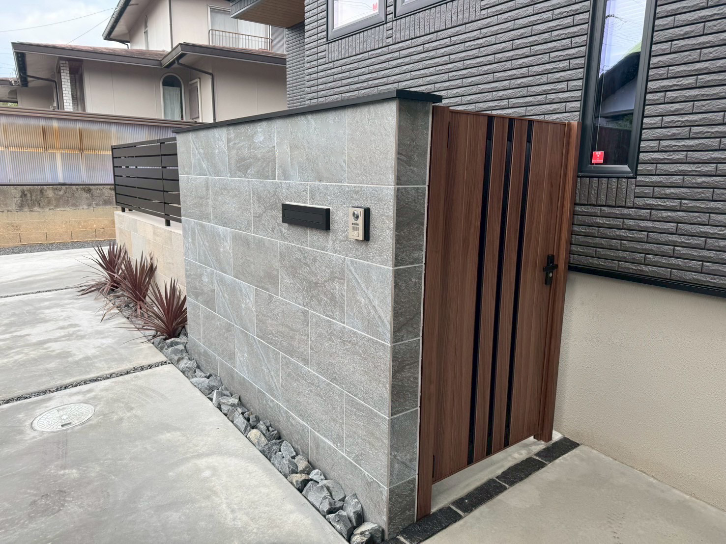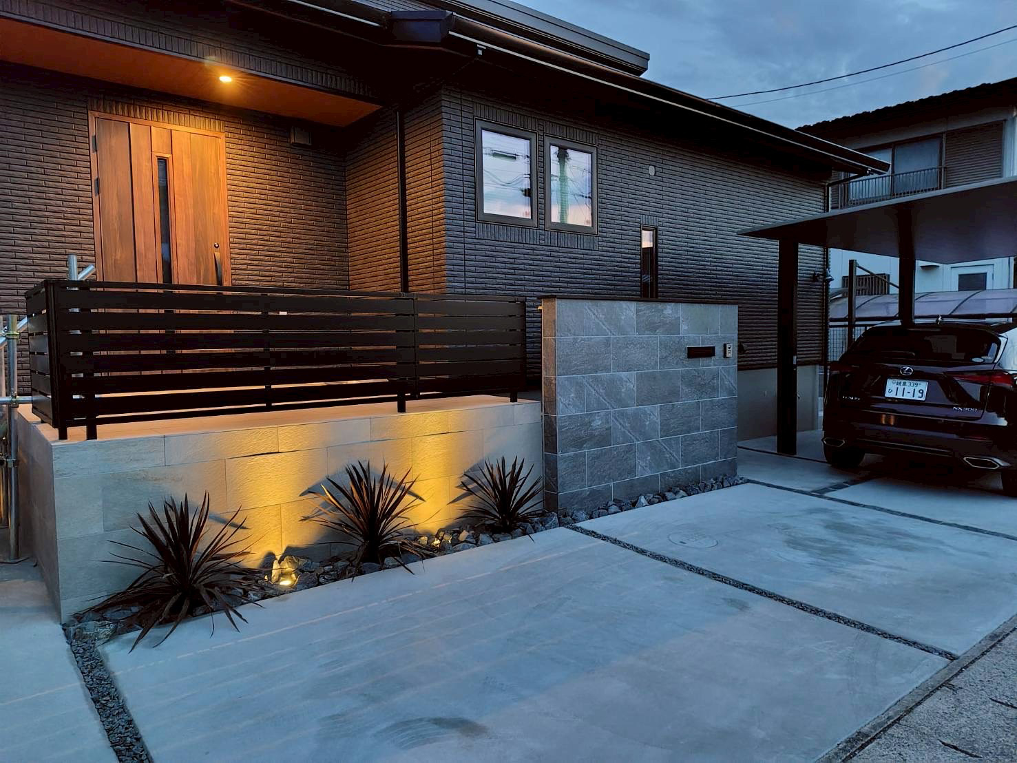 シンプルながら存在感のある外構をデザイン。 門柱の質感と植栽の色味がアクセントとなり、住まい全体を美しく引き立てます。
