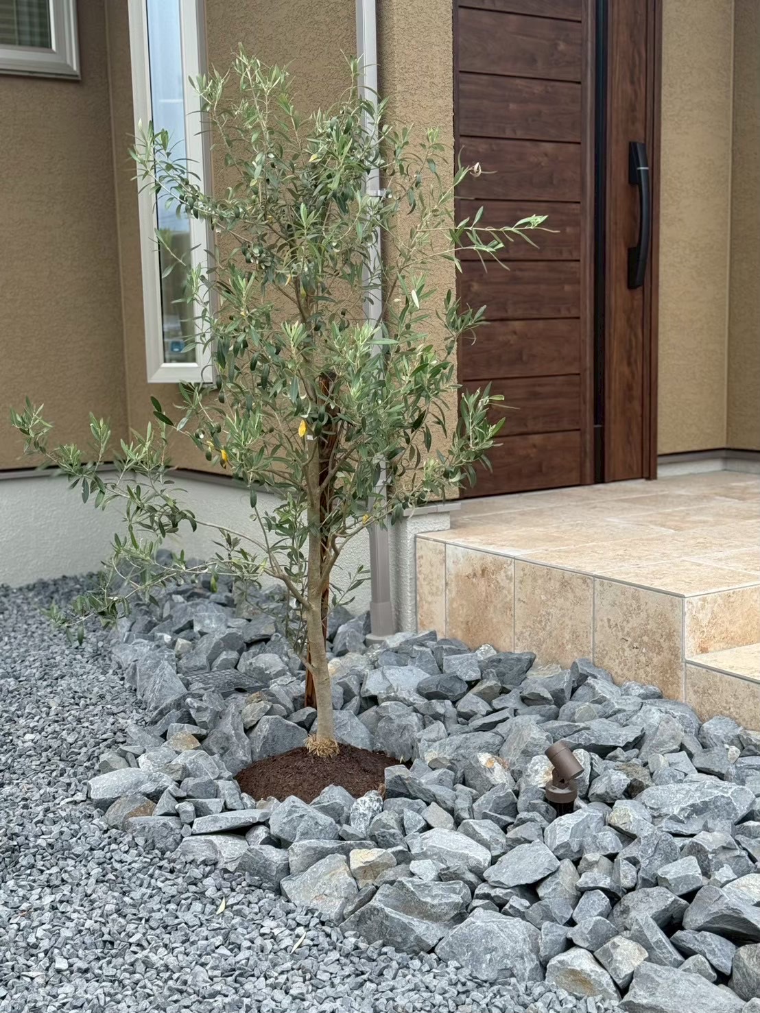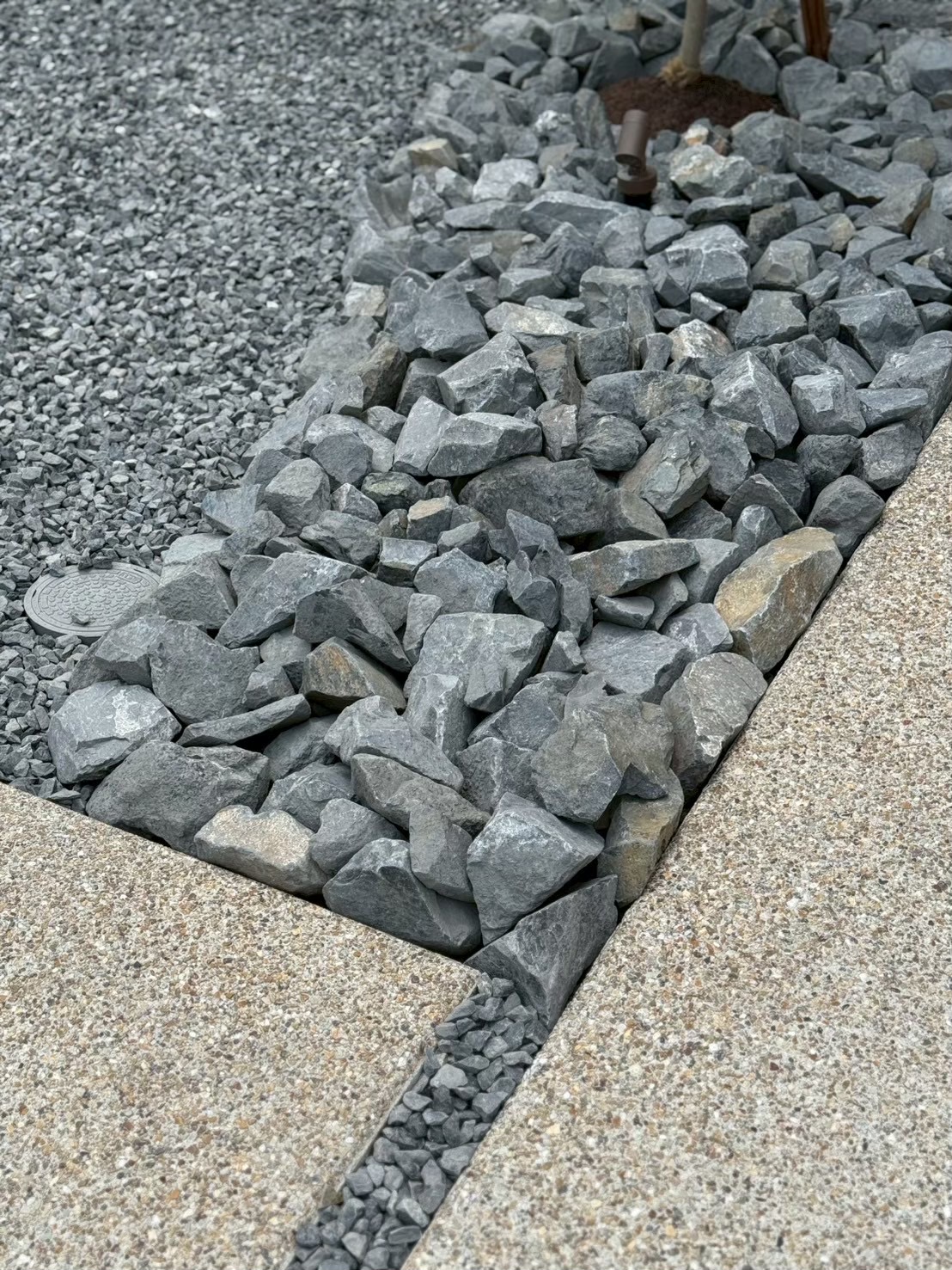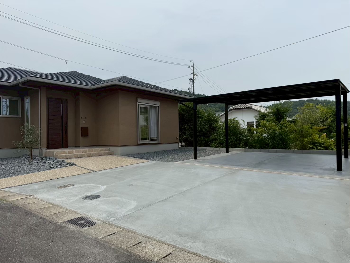 シンプルで開放感のある外構を施工しました。 カーポートと土間コンクリートで使い勝手の良い駐車スペースを確保し、植栽・割石でやわらかな表情をプラス。 目隠しフェンスを設置し、プライバシーと景観の両立を実現しています。